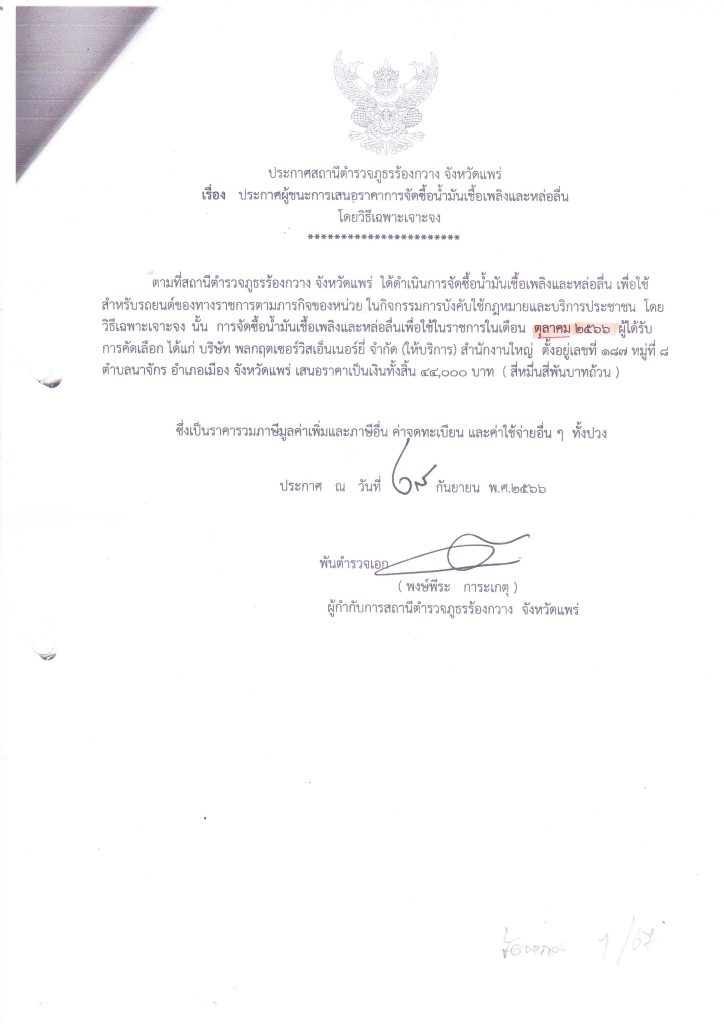 ประกาศ ต.ค.๒๕๖๖ ผู้ชนะการเสนอราคาการจัดซื้อน้ำมันเชื้อเพลิงและหล่อลื่นโดยวิธีเฉพาะเจาะจง
