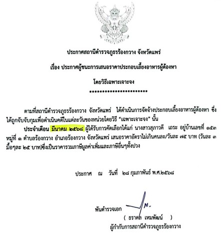 ประกาศ เดือน กุมภาพันธ์ ๒๕๖๘ ผู้ชนะการเสนอราคาประกอบเลี้ยงอาหารผู้ต้องหา