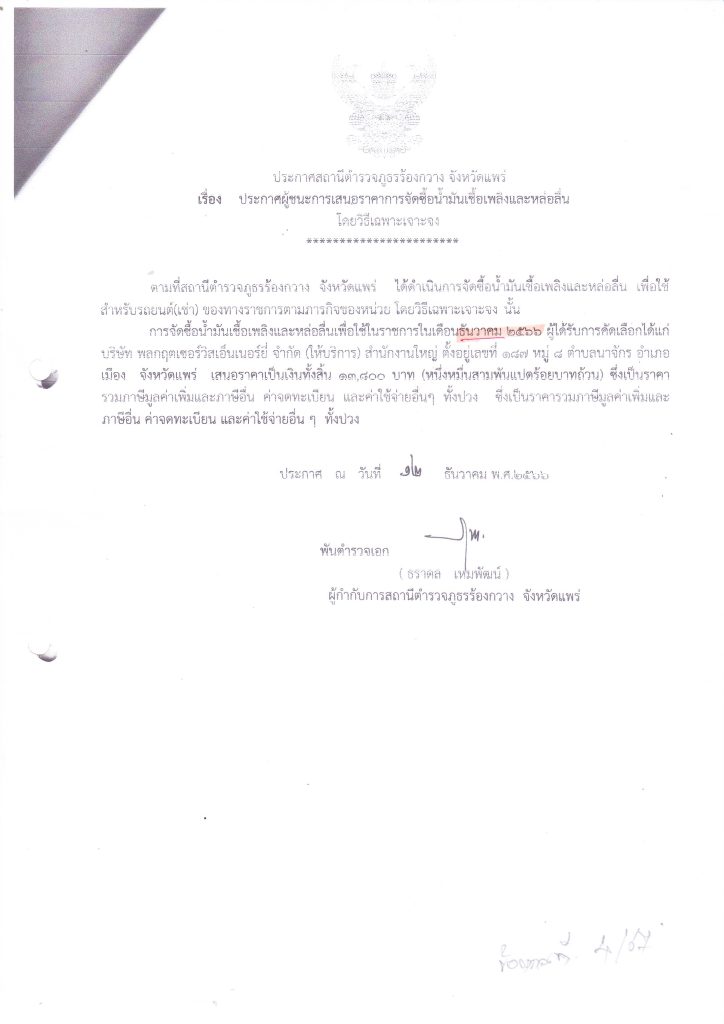 ประกาศ เดือน ธันวาคม ๒๕๖๖ ฉบับที่ ๒ ผู้ชนะการเสนอราคาการจัดซื้อน้ำมันเชื้อเพลิงและหล่อลื่นโดยวิธีเฉพาะเจาะจง