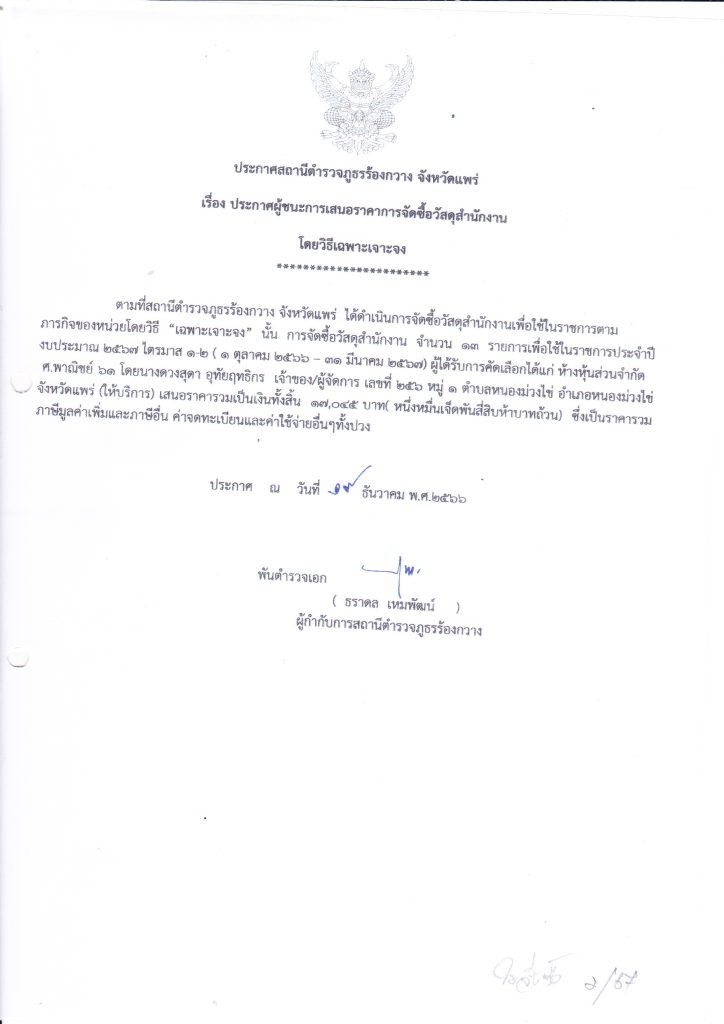 ประกาศ เดือน ธันวาคม ๒๕๖๖ ฉบับที่ ๕ ผู้ชนะการเสนอราคาการจัดซื้อวัสดุสำนักงานโดยวิธีเฉพาะเจาะจง