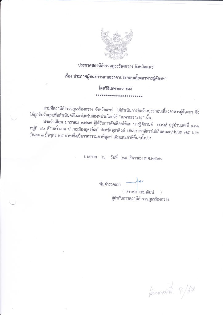 ประกาศ เดือน มกราคม ๒๕๖๗ ฉบับที่ ๓ ผู้ชนะการเสนอราคาประกอบเลี้ยงอาหารผู้ต้องหาโดยวิธีเฉพาะเจาะจง